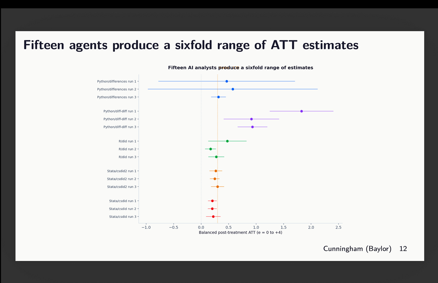 Last week I had Claude implement a “multi-analyst design” across 5 Callaway and Sant’Anna packages (2 in python, 1 in R, 2 in Stata) on a fixed dataset, a universal baseline, ~20 covariates to choose from for satisfying conditional parallel trends, and the same target parameter. You can find that here: