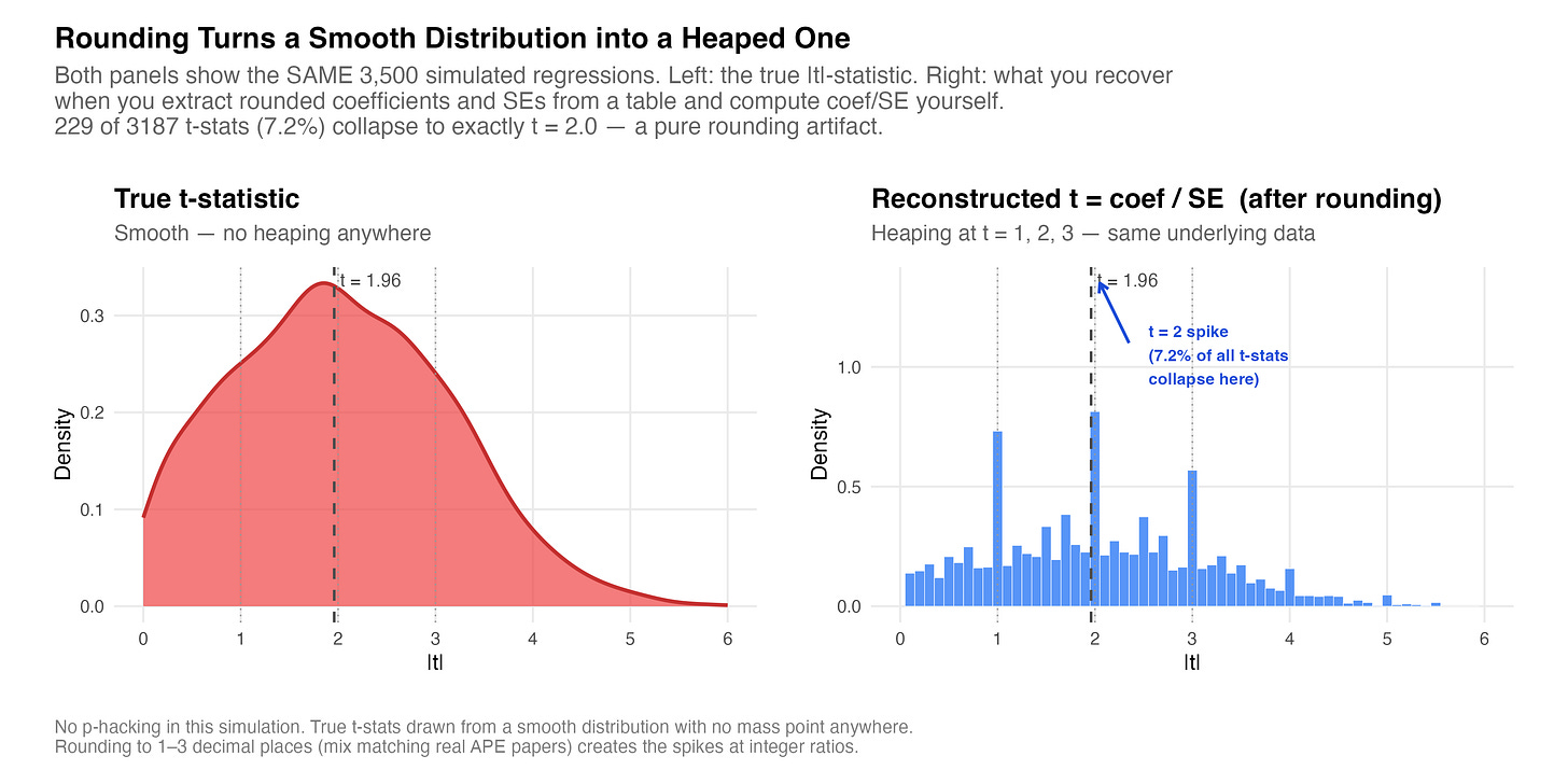 The Brodeur et al. (2020) p-hacking test doesn’t use reported coefficients and standard errors from published papers to then compute t-statistics. Rather, they used the t-statistic from software output. Brodeur et al. were more careful about this than I had been. They extracted t-stats directly from regression tables that printed them, or converted reported p-values to z-scores. They specifically avoided reconstructing t-stats from rounded coefficients and standard errors precisely because of what I just described and that I have learned the hard way.