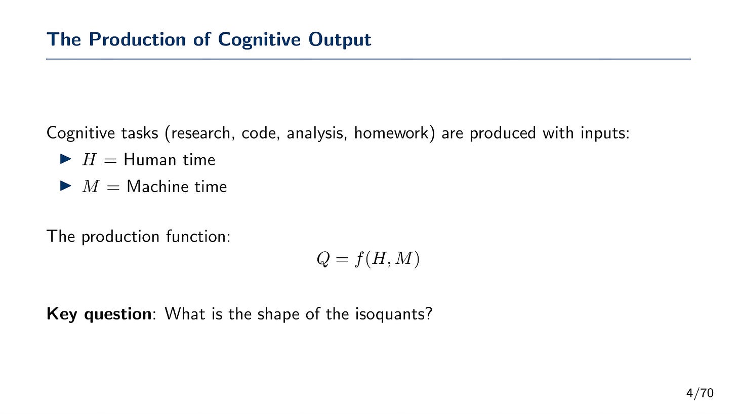 This is Part 2 of a multi-part series on using AI agents for economics research. Part 1 introduced the landscape. This entry develops the theory underlying a lot of the arguments I’ll make in subsequent posts, but this is also a theory I’ve been posting about it for a year or two on here. I just wanted it all in one place, plus I wanted to show you the cool slides I made. This is also based on a talk I gave at the Boston Fed Monday, and I just wanted to also lay out that talk in case anyone wanted to read it too. Some of it gets a little repetitive, plus some of you have seem me write about this or present on it, but like I said, I wanted to get it down on paper.