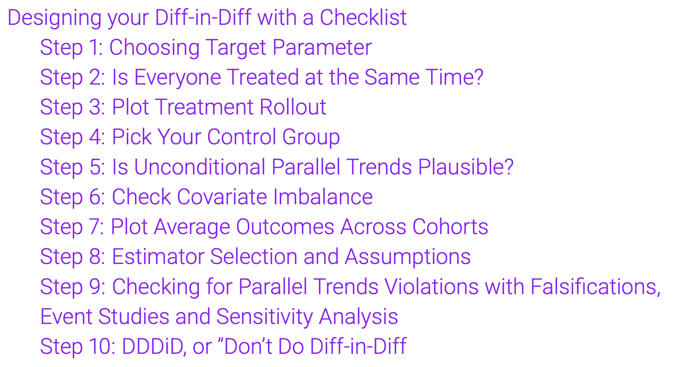 Greetings! Today I am posting two new 15-minute videos for Mixtape University. This is for my “Diff-in-diff with a checklist” series. It will be based on my workshop, Causal Inference 2. And at the moment, this is my checklist (although last week the way I taught this in a workshop, I found that Steps 4-6 have not yet fully gelled in my mind if that will be how I do it when I get to those steps for this series — but we have time to fix that).