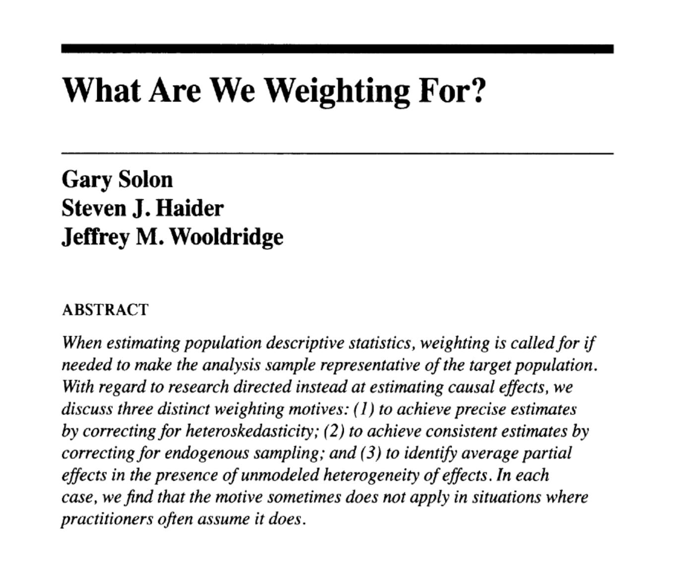 This material is something that slowly percolated in my head after years of teaching this material, only for a then stray comment by Andrew Goodman-Bacon to make me realize it was largely what Gary Solon, Steven Haider and Jeffrey Wooldridge wrote about in this 2015 JHR article “What are we weighting for?”